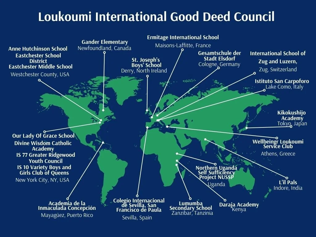 The Loukoumi Foundation hosts an International Good Deed Council of schools worldwide, monthly, across 14 hours of time zones, these students enthusiastically meet on Zoom to share their cultures and customs, the good deed projects they are working on in their communities and together they collaborate on global good deed projects.